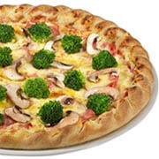 Tomatensauce, Putenschinken, Champignons, Broccoli und Käse