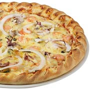 Tomatensauce, Meeresfrüchte, Zwiebeln und Käse