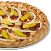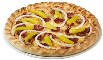 Tomatensauce, Knoblauchwurst, Peperoni, Zwiebeln und Käse